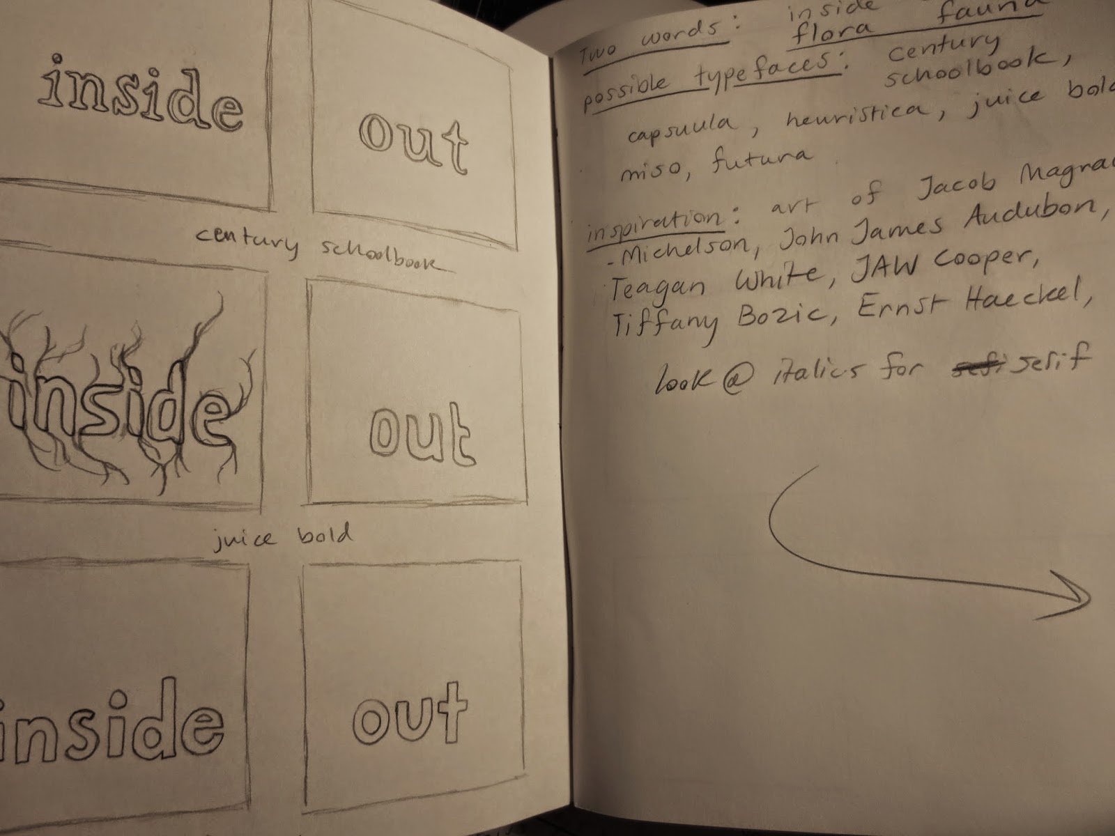 top - initial planning stage. I originally thought I would use the words "inside out" for my main concept, but eventually decided to switch to "flora" and "fauna" for my final illustrations.